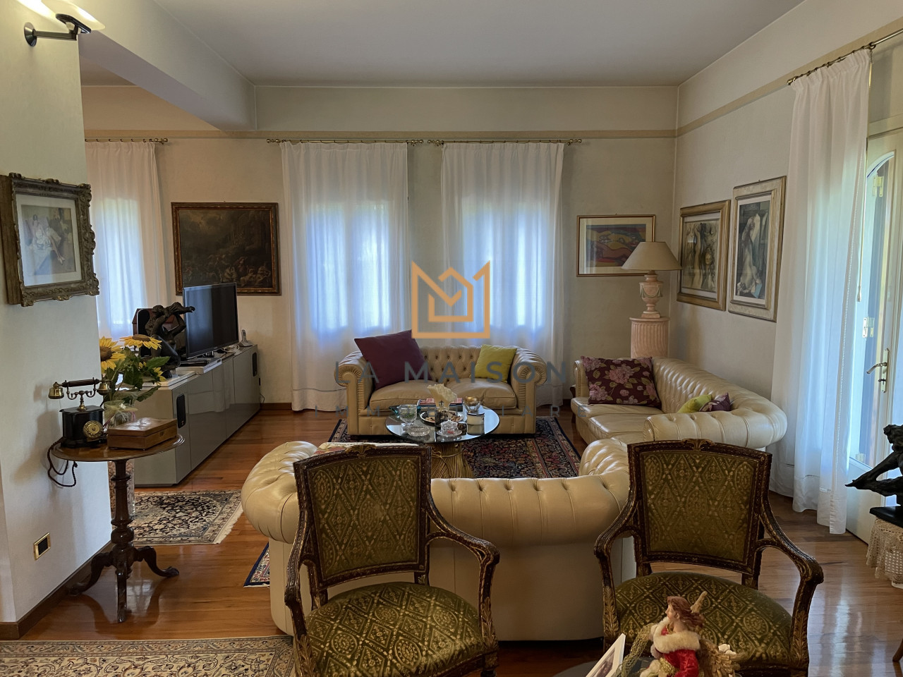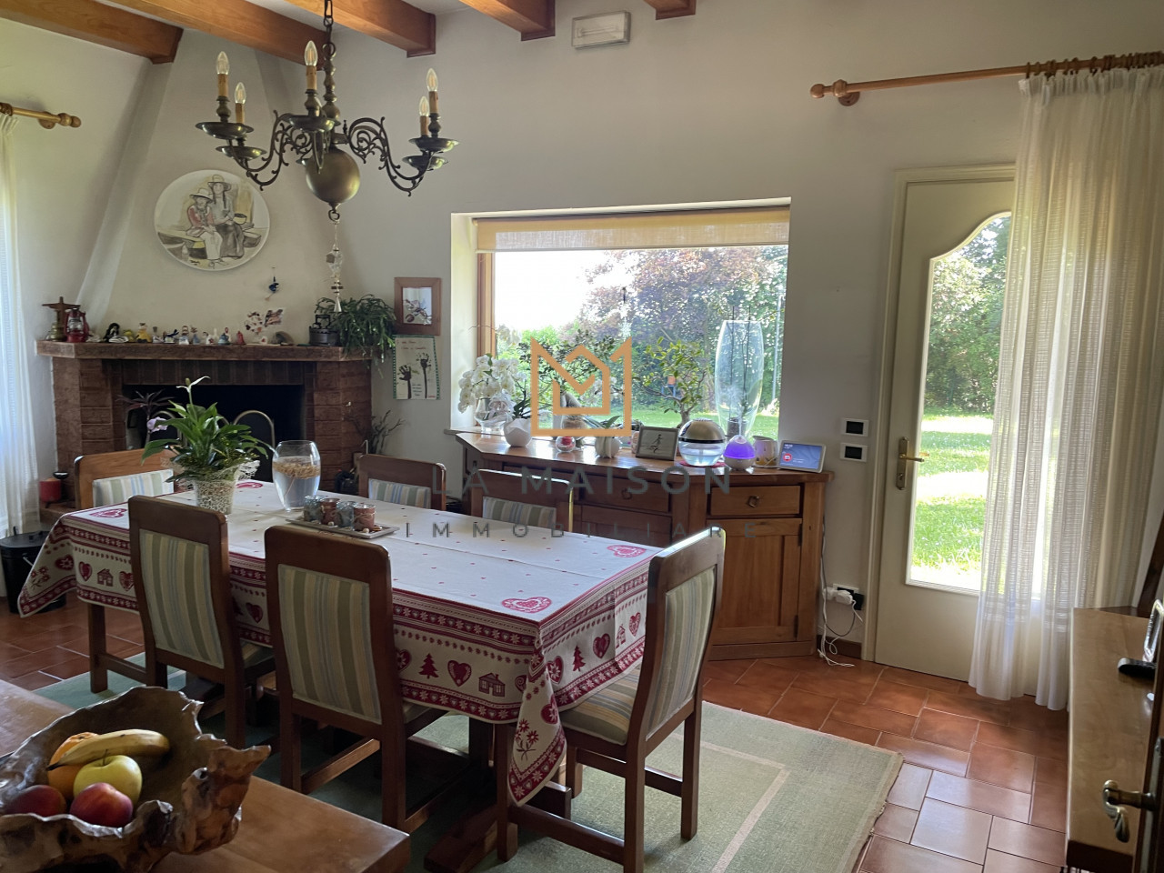 L'abitazione ha un layout a pianta aperta con spazi ariosi e ben distribuiti. Entrando si viene accolti da un ingresso che collega i due lati della villa nord e sud, fornendo due accessi all'abitazione. Sulle ali si sviluppano i vari ambienti, come il salone che è splendidamente illuminato da una serie di grandi vetrate ad arco poste sul lato Est che danno vita ad una bella veranda vivibile in ogni periodo dell'anno.